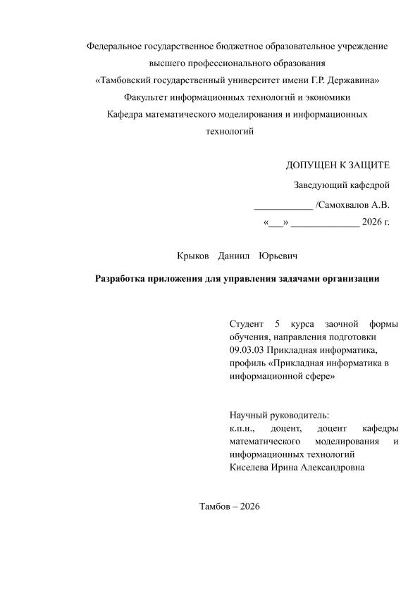 КРЫКОВ, ДАНИИЛ ЮРЬЕВИЧ. РАЗРАБОТКА ПРИЛОЖЕНИЯ ДЛЯ УПРАВЛЕНИЯ ЗАДАЧАМИ ОРГАНИЗАЦИИ [Электронный ресурс]: бакалаврская работа: 09.03.03 Прикладная информатика: Прикладная информатика в информационной сфере: Заочная форма обучения / Д. Ю. КРЫКОВ; ТГУ им. Г. Р. Державина ; науч. рук. к. пед. н., доцент, И. А. Киселева. — Электрон. текстовые дан. (1 файл). — Тамбов, 2026. — Загл. с титул. экрана. — <URL:https://elibrary.tsutmb.ru/dl/docs/vkr19117.pdf>.