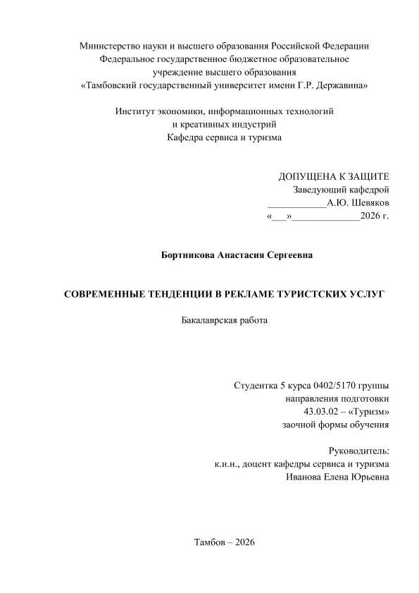БОРТНИКОВА, АНАСТАСИЯ СЕРГЕЕВНА. СОВРЕМЕННЫЕ ТЕНДЕНЦИИ В РЕКЛАМЕ ТУРИСТСКИХ УСЛУГ [Электронный ресурс]: бакалаврская работа: 43.03.02 Туризм: Заочная форма обучения / А. С. БОРТНИКОВА; ТГУ им. Г. Р. Державина ; науч. рук. к. э. н., доцент, Е. Ю. Иванова. — Электрон. текстовые дан. (1 файл). — Тамбов, 2026. — Загл. с титул. экрана. — <URL:https://elibrary.tsutmb.ru/dl/docs/vkr19118.pdf>.