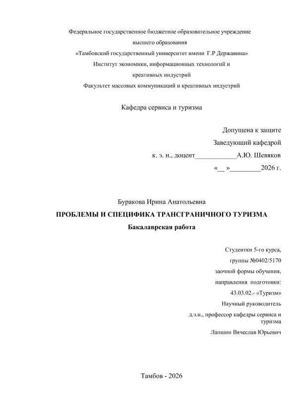 БУРАКОВА, ИРИНА АНАТОЛЬЕВНА. ПРОБЛЕМЫ И СПЕЦИФИКА ТРАНСГРАНИЧНОГО ТУРИЗМА [Электронный ресурс]: бакалаврская работа: 43.03.02 Туризм: Заочная форма обучения / И. А. БУРАКОВА; ТГУ им. Г. Р. Державина ; науч. рук. д. э. н., профессор, В. Ю. Лапшин. — Электрон. текстовые дан. (1 файл). — Тамбов, 2026. — Загл. с титул. экрана. — <URL:https://elibrary.tsutmb.ru/dl/docs/vkr19119.pdf>.