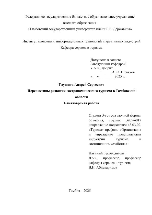 ГЛУШКОВ, АНДРЕЙ СЕРГЕЕВИЧ. ПЕРСПЕКТИВЫ РАЗВИТИЯ ГАСТРОНОМИЧЕСКОГО ТУРИЗМА В ТАМБОВСКОЙ ОБЛАСТИ [Электронный ресурс]: бакалаврская работа: 43.03.02 Туризм: Заочная форма обучения / А. С. ГЛУШКОВ; ТГУ им. Г. Р. Державина ; науч. рук. д. э. н., профессор, В. И. Абдукаримов. — Электрон. текстовые дан. (1 файл). — Тамбов, 2026. — Загл. с титул. экрана. — <URL:https://elibrary.tsutmb.ru/dl/docs/vkr19120.pdf>.