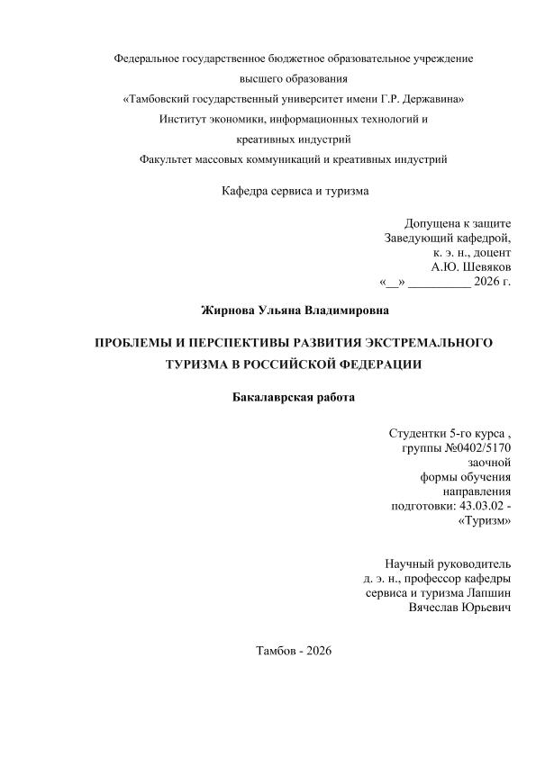 ЖИРНОВА, УЛЬЯНА ВЛАДИМИРОВНА. ПРОБЛЕМЫ И ПЕРСПЕКТИВЫ РАЗВИТИЯ ЭКСТРЕМАЛЬНОГО ТУРИЗМА В РОССИЙСКОЙ ФЕДЕРАЦИИ [Электронный ресурс]: бакалаврская работа: 43.03.02 Туризм: Заочная форма обучения / У. В. ЖИРНОВА; ТГУ им. Г. Р. Державина ; науч. рук. д. э. н., профессор, В. Ю. Лапшин. — Электрон. текстовые дан. (1 файл). — Тамбов, 2026. — Загл. с титул. экрана. — <URL:https://elibrary.tsutmb.ru/dl/docs/vkr19121.pdf>.