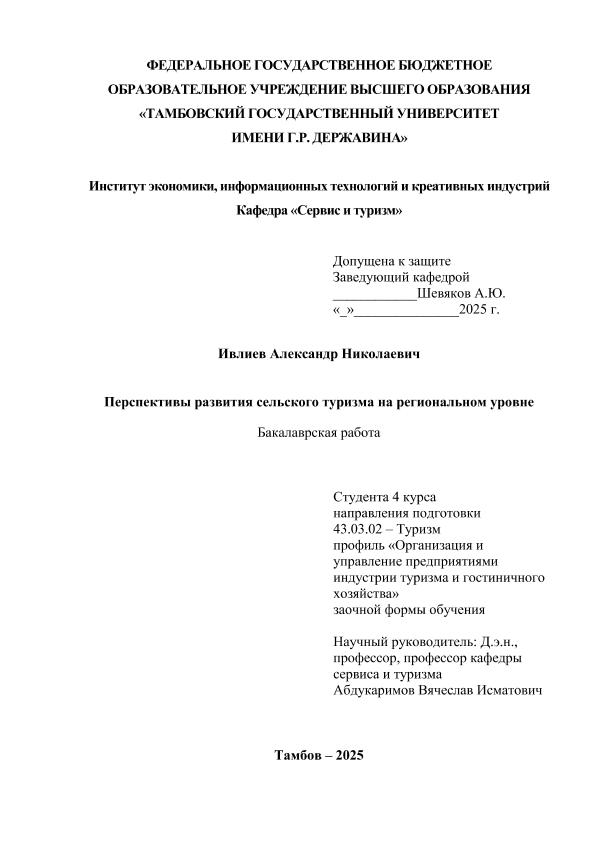 ИВЛИЕВ, АЛЕКСАНДР НИКОЛАЕВИЧ. ПЕРСПЕКТИВЫ РАЗВИТИЯ СЕЛЬСКОГО ТУРИЗМА НА РЕГИОНАЛЬНОМ УРОВНЕ [Электронный ресурс]: бакалаврская работа: 43.03.02 Туризм: Заочная форма обучения / А. Н. ИВЛИЕВ; ТГУ им. Г. Р. Державина ; науч. рук. д. э. н., профессор, В. И. Абдукаримов. — Электрон. текстовые дан. (1 файл). — Тамбов, 2026. — Загл. с титул. экрана. — <URL:https://elibrary.tsutmb.ru/dl/docs/vkr19122.pdf>.