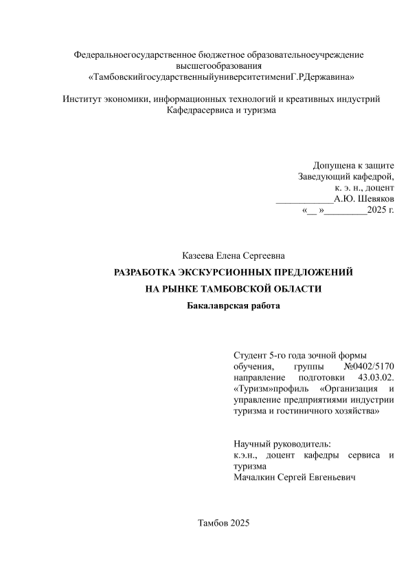 КАЗЕЕВА, ЕЛЕНА СЕРГЕЕВНА. РАЗРАБОТКА ЭКСКУРСИОННЫХ ПРЕДЛОЖЕНИЙ НА РЫНКЕ ТАМБОВСКОЙ ОБЛАСТИ [Электронный ресурс]: бакалаврская работа: 43.03.02 Туризм: Заочная форма обучения / Е. С. КАЗЕЕВА; ТГУ им. Г. Р. Державина ; науч. рук. к. г. н., доцент, С. Е. Мачалкин. — Электрон. текстовые дан. (1 файл). — Тамбов, 2026. — Загл. с титул. экрана. — <URL:https://elibrary.tsutmb.ru/dl/docs/vkr19123.pdf>.