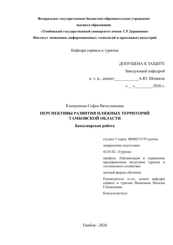 КЛИМУШИНА, СОФЬЯ ВЯЧЕСЛАВОВНА. ПЕРСПЕКТИВЫ РАЗВИТИЯ ПЛЯЖНЫХ ТЕРРИТОРИЙ ТАМБОВСКОЙ ОБЛАСТИ [Электронный ресурс]: бакалаврская работа: 43.03.02 Туризм: Заочная форма обучения / С. В. КЛИМУШИНА; ТГУ им. Г. Р. Державина ; науч. рук. к. пед. н., доцент, Н. Г. Выжимова. — Электрон. текстовые дан. (1 файл). — Тамбов, 2026. — Загл. с титул. экрана. — <URL:https://elibrary.tsutmb.ru/dl/docs/vkr19124.pdf>.