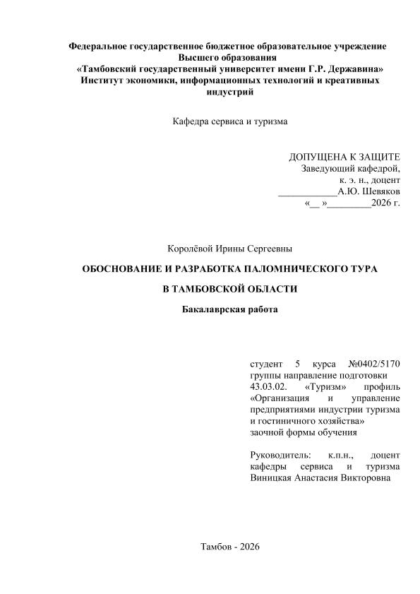 КОРОЛЕВА, ИРИНА СЕРГЕЕВНА. ОБОСНОВАНИЕ И РАЗРАБОТКА ПАЛОМНИЧЕСКОГО ТУРА В ТАМБОВСКОЙ ОБЛАСТИ [Электронный ресурс]: бакалаврская работа: 43.03.02 Туризм: Заочная форма обучения / И. С. КОРОЛЕВА; ТГУ им. Г. Р. Державина ; науч. рук. к. пед. н., доцент, А. В. ВИНИЦКАЯ. — Электрон. текстовые дан. (1 файл). — Тамбов, 2026. — Загл. с титул. экрана. — <URL:https://elibrary.tsutmb.ru/dl/docs/vkr19125.pdf>.