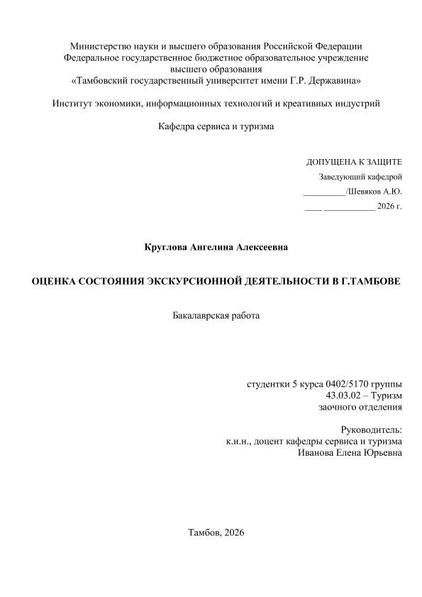 КРУГЛОВА, АНГЕЛИНА АЛЕКСЕЕВНА. ОЦЕНКА СОСТОЯНИЯ ЭКСКУРСИОННОЙ ДЕЯТЕЛЬНОСТИ В Г.ТАМБОВЕ [Электронный ресурс]: бакалаврская работа: 43.03.02 Туризм: Заочная форма обучения / А. А. КРУГЛОВА; ТГУ им. Г. Р. Державина ; науч. рук. к. э. н., доцент, Е. Ю. Иванова. — Электрон. текстовые дан. (1 файл). — Тамбов, 2026. — Загл. с титул. экрана. — <URL:https://elibrary.tsutmb.ru/dl/docs/vkr19126.pdf>.