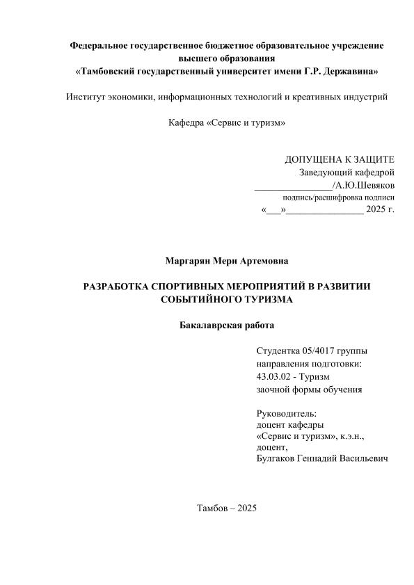 МАРГАРЯН, МЕРИ АРТЕМОВНА. РАЗРАБОТКА СПОРТИВНЫХ МЕРОПРИЯТИЙ В РАЗВИТИИ СОБЫТИЙНОГО ТУРИЗМА [Электронный ресурс]: бакалаврская работа: 43.03.02 Туризм: Заочная форма обучения / М. А. МАРГАРЯН; ТГУ им. Г. Р. Державина ; науч. рук. к. э. н., доцент, Г. В. Булгаков. — Электрон. текстовые дан. (1 файл). — Тамбов, 2026. — Загл. с титул. экрана. — <URL:https://elibrary.tsutmb.ru/dl/docs/vkr19127.pdf>.