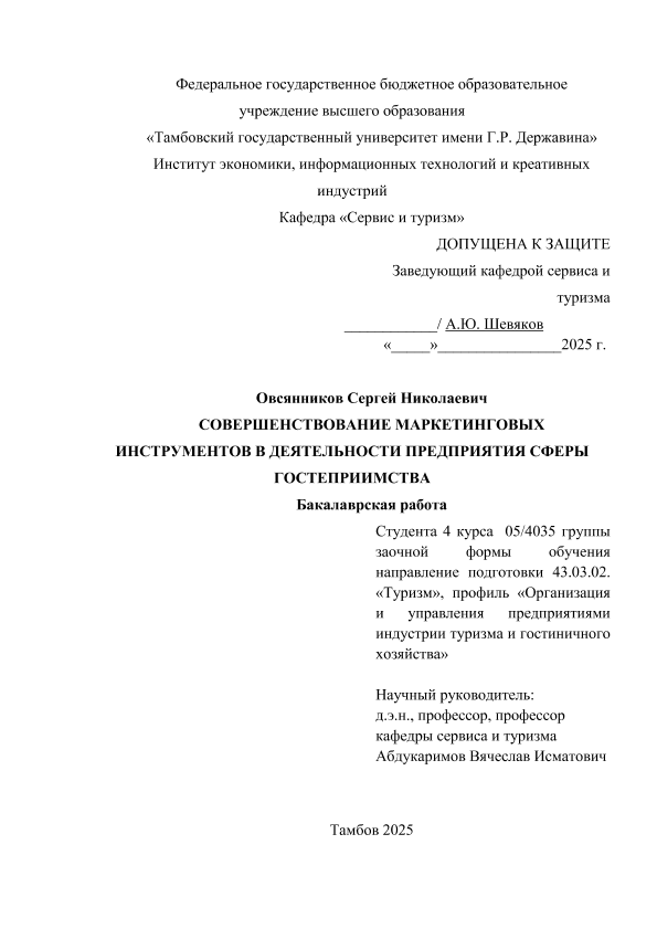 ОВСЯННИКОВ, СЕРГЕЙ НИКОЛАЕВИЧ. СОВЕРШЕНСТВОВАНИЕ МАРКЕТИНГОВЫХ ИНСТРУМЕНТОВ В ДЕЯТЕЛЬНОСТИ ПРЕДПРИЯТИЯ СФЕРЫ ГОСТЕПРИИМСТВА [Электронный ресурс]: бакалаврская работа: 43.03.02 Туризм: Заочная форма обучения / С. Н. ОВСЯННИКОВ; ТГУ им. Г. Р. Державина ; науч. рук. д. э. н., профессор, В. И. Абдукаримов. — Электрон. текстовые дан. (1 файл). — Тамбов, 2026. — Загл. с титул. экрана. — <URL:https://elibrary.tsutmb.ru/dl/docs/vkr19128.pdf>.
