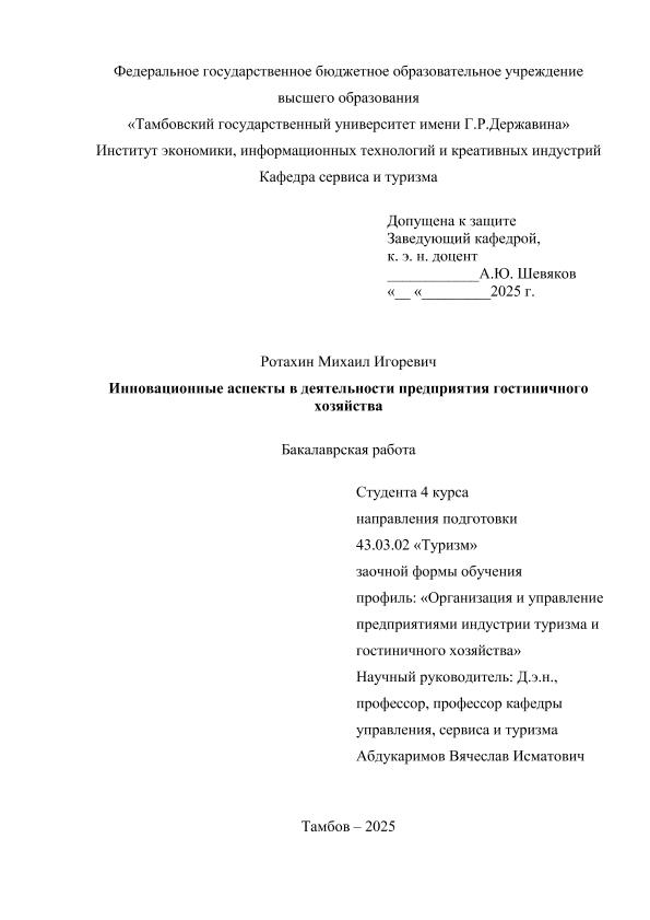 РОТАХИН, МИХАИЛ ИГОРЕВИЧ. ИННОВАЦИОННЫЕ АСПЕКТЫ В ДЕЯТЕЛЬНОСТИ ПРЕДПРИЯТИЯ ГОСТИНИЧНОГО ХОЗЯЙСТВА [Электронный ресурс]: бакалаврская работа: 43.03.02 Туризм: Заочная форма обучения / М. И. РОТАХИН; ТГУ им. Г. Р. Державина ; науч. рук. д. э. н., профессор, В. И. Абдукаримов. — Электрон. текстовые дан. (1 файл). — Тамбов, 2026. — Загл. с титул. экрана. — <URL:https://elibrary.tsutmb.ru/dl/docs/vkr19129.pdf>.