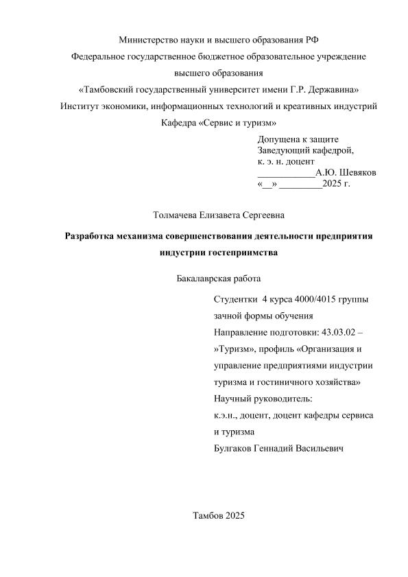 ТОЛМАЧЕВА, ЕЛИЗАВЕТА СЕРГЕЕВНА. РАЗРАБОТКА МЕХАНИЗМА СОВЕРШЕНСТВОВАНИЯ ДЕЯТЕЛЬНОСТИ ПРЕДПРИЯТИЯ ИНДУСТРИИ ГОСТЕПРИИМСТВА [Электронный ресурс]: бакалаврская работа: 43.03.02 Туризм: Заочная форма обучения / Е. С. ТОЛМАЧЕВА; ТГУ им. Г. Р. Державина ; науч. рук. к. э. н., доцент, Г. В. Булгаков. — Электрон. текстовые дан. (1 файл). — Тамбов, 2026. — Загл. с титул. экрана. — <URL:https://elibrary.tsutmb.ru/dl/docs/vkr19130.pdf>.