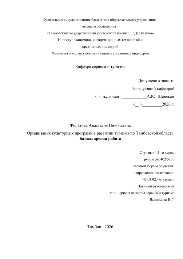 ФИЛАТОВА, АНАСТАСИЯ НИКОЛАЕВНА. ОРГАНИЗАЦИЯ КУЛЬТУРНЫХ ПРОГРАММ В РАЗВИТИИ ТУРИЗМА ПО ТАМБОВСКОЙ ОБЛАСТИ [Электронный ресурс]: бакалаврская работа: 43.03.02 Туризм: Заочная форма обучения / А. Н. ФИЛАТОВА; ТГУ им. Г. Р. Державина ; науч. рук. к. пед. н., доцент, Н. Г. Выжимова. — Электрон. текстовые дан. (1 файл). — Тамбов, 2026. — Загл. с титул. экрана. — <URL:https://elibrary.tsutmb.ru/dl/docs/vkr19131.pdf>.