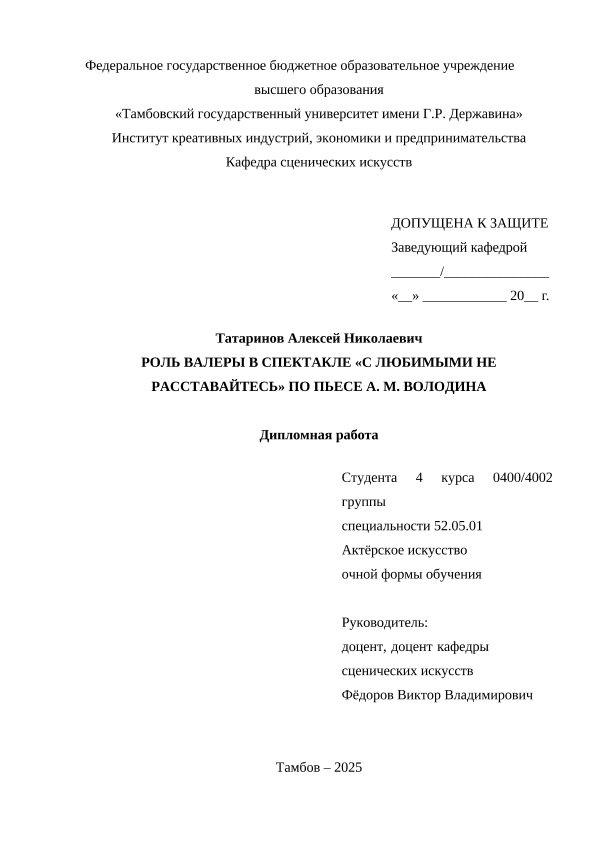 ТАТАРИНОВ, АЛЕКСЕЙ НИКОЛАЕВИЧ. РОЛЬ ВАЛЕРЫ В СПЕКТАКЛЕ «С ЛЮБИМЫМИ НЕ РАССТАВАЙТЕСЬ» ПО ПЬЕСЕ А. М. ВОЛОДИНА [Электронный ресурс]: дипломная работа: 52.05.01 Актерское искусство: Очная форма обучения / А. Н. ТАТАРИНОВ; ТГУ им. Г. Р. Державина ; науч. рук. к. сцен. н., доцент, В. В. Федоров. — Электрон. текстовые дан. (1 файл). — Тамбов, 2025. — Загл. с титул. экрана. — <URL:https://elibrary.tsutmb.ru/dl/docs/vkr18502.pdf>.