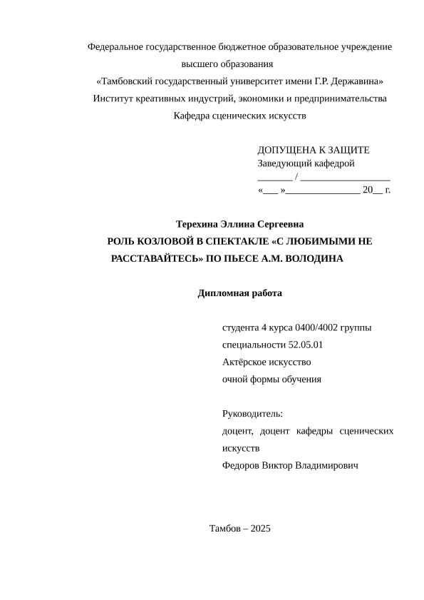 ТЕРЕХИНА, ЭЛЛИНА СЕРГЕЕВНА. РОЛЬ КОЗЛОВОЙ В СПЕКТАКЛЕ «С ЛЮБИМЫМИ НЕ РАССТАВАЙТЕСЬ» ПО ПЬЕСЕ А.М. ВОЛОДИНА [Электронный ресурс]: дипломная работа: 52.05.01 Актерское искусство: Очная форма обучения / Э. С. ТЕРЕХИНА; ТГУ им. Г. Р. Державина ; науч. рук. к. сцен. н., доцент, В. В. Федоров. — Электрон. текстовые дан. (1 файл). — Тамбов, 2025. — Загл. с титул. экрана. — <URL:https://elibrary.tsutmb.ru/dl/docs/vkr18503.pdf>.