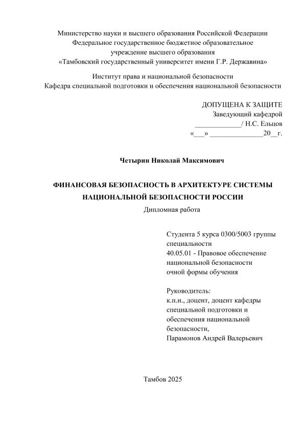 ЧЕТЫРИН, НИКОЛАЙ МАКСИМОВИЧ. ФИНАНСОВАЯ БЕЗОПАСНОСТЬ В АРХИТЕКТУРЕ СИСТЕМЫ НАЦИОНАЛЬНОЙ БЕЗОПАСНОСТИ РОССИИ [Электронный ресурс]: дипломная работа: 40.05.01 Правовое обеспечение национальной безопасности: Очная форма обучения / Н. М. ЧЕТЫРИН; ТГУ им. Г. Р. Державина ; науч. рук. к. пед. н., доцент, А. В. Парамонов. — Электрон. текстовые дан. (1 файл). — Тамбов, 2025. — Загл. с титул. экрана. — <URL:https://elibrary.tsutmb.ru/dl/docs/vkr18582.pdf>.