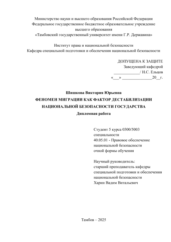 ШИШКОВА, ВИКТОРИЯ ЮРЬЕВНА. ФЕНОМЕН МИГРАЦИИ КАК ФАКТОР ДЕСТАБИЛИЗАЦИИ НАЦИОНАЛЬНОЙ БЕЗОПАСНОСТИ ГОСУДАРСТВА [Электронный ресурс]: дипломная работа: 40.05.01 Правовое обеспечение национальной безопасности: Очная форма обучения / В. Ю. ШИШКОВА; ТГУ им. Г. Р. Державина ; науч. рук. , старший преподаватель, В. В. Харин. — Электрон. текстовые дан. (1 файл). — Тамбов, 2025. — Загл. с титул. экрана. — <URL:https://elibrary.tsutmb.ru/dl/docs/vkr18583.pdf>.