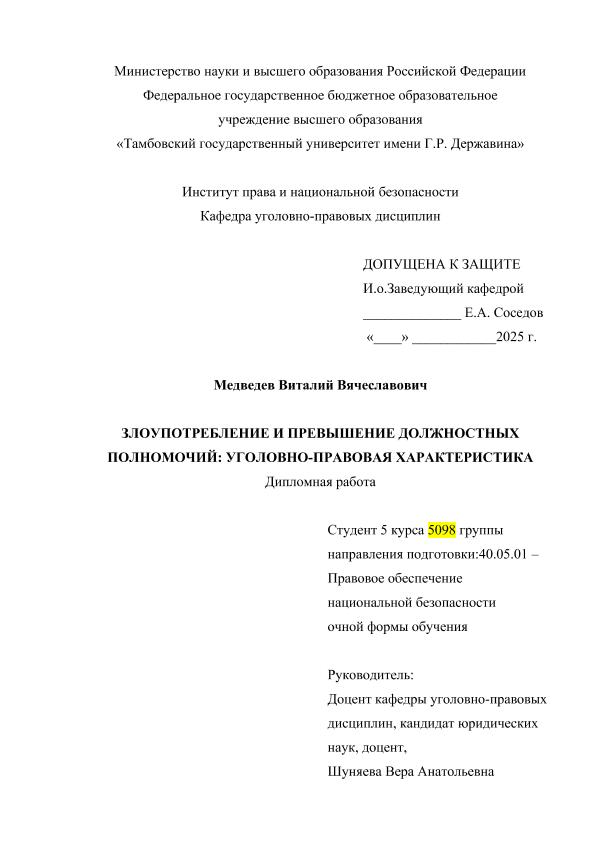 МЕДВЕДЕВ, ВИТАЛИЙ ВЯЧЕСЛАВОВИЧ. ЗЛОУПОТРЕБЛЕНИЕ И ПРЕВЫШЕНИЕ ДОЛЖНОСТНЫХ ПОЛНОМОЧИЙ: УГОЛОВНО-ПРАВОВАЯ ХАРАКТЕРИСТИКА [Электронный ресурс]: дипломная работа: 40.05.01 Правовое обеспечение национальной безопасности: Очная форма обучения / В. В. МЕДВЕДЕВ; ТГУ им. Г. Р. Державина ; науч. рук. к. ю. н., доцент, В. А. Шуняева. — Электрон. текстовые дан. (1 файл). — Тамбов, 2025. — Загл. с титул. экрана. — <URL:https://elibrary.tsutmb.ru/dl/docs/vkr18586.pdf>.