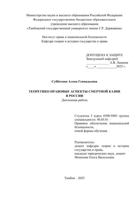 СУББОТИНА, АЛЕНА ГЕННАДЬЕВНА. ТЕОРЕТИКО-ПРАВОВЫЕ АСПЕКТЫ СМЕРТНОЙ КАЗНИ В РОССИИ [Электронный ресурс]: дипломная работа: 40.05.01 Правовое обеспечение национальной безопасности: Очная форма обучения / А. Г. СУББОТИНА; ТГУ им. Г. Р. Державина ; науч. рук. к. ю. н., доцент, О. В Моисеева. — Электрон. текстовые дан. (1 файл). — Тамбов, 2025. — Загл. с титул. экрана. — <URL:https://elibrary.tsutmb.ru/dl/docs/vkr18588.pdf>.
