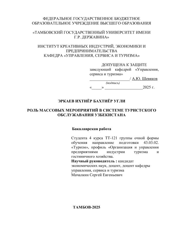 ЭРКАЕВ, ИХТИЁР БАХТИЁР. РОЛЬ МАССОВЫХ МЕРОПРИЯТИЙ В СИСТЕМЕ ТУРИСТСКОГО ОБСЛУЖАВАНИЯ УЗБЕКИСТАНА [Электронный ресурс]: бакалаврская работа: 43.03.02 Туризм: Организация и управление предприятиями индустрии туризма и гостиничного хозяйства: Очная форма обучения / И. Б. ЭРКАЕВ; ТГУ им. Г. Р. Державина ; науч. рук. к. э. н., доцент, С. Е. МАЧАЛКИН. — Электрон. текстовые дан. (1 файл). — Тамбов, 2025. — Загл. с титул. экрана. — <URL:https://elibrary.tsutmb.ru/dl/docs/vkr18598.pdf>.