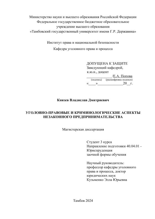 КНЯЗЕВ, ВЛАДИСЛАВ ДМИТРИЕВИЧ. УГОЛОВНО-ПРАВОВЫЕ И КРИМИНОЛОГИЧЕСКИЕ АСПЕКТЫ НЕЗАКОННОГО ПРЕДПРИНИМАТЕЛЬСТВА [Электронный ресурс]: магистерская диссертация: 40.04.01 Юриспруденция: Уголовное право, криминология,