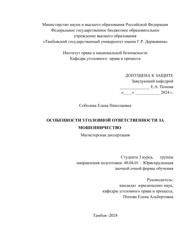 СОБОЛЕВА, ЕЛЕНА НИКОЛЕВНА. ОСОБЕННОСТИ УГОЛОВНОЙ ОТВЕТСТВЕННОСТИ ЗА МОШЕННИЧЕСТВО [Электронный ресурс]: магистерская диссертация: 40.04.01 Юриспруденция: Уголовное право, криминология,