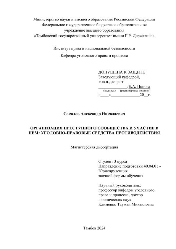 СОКОЛОВ, АЛЕКСАНДР НИКОЛАЕВИЧ. ОРГАНИЗАЦИЯ ПРЕСТУПНОГО СООБЩЕСТВА И УЧАСТИЕ В НЕМ: УГОЛОВНО-ПРАВОВЫЕ СРЕДСТВА ПРОТИВОДЕЙСТВИЯ [Электронный ресурс]: магистерская диссертация: 40.04.01 Юриспруденция: Уголовное право, криминология,