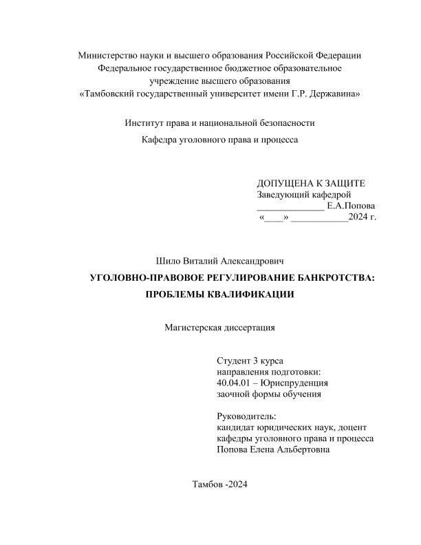ШИЛО, ВИТАЛИЙ АЛЕКСАНДРОВИЧ. УГОЛОВНО-ПРАВОВОЕ РЕГУЛИРОВАНИЕ БАНКРОТСТВА: ПРОБЛЕМЫ КВАЛИФИКАЦИИ [Электронный ресурс]: магистерская диссертация: 40.04.01 Юриспруденция: Уголовное право, криминология,