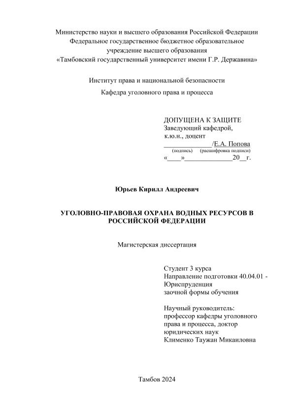 ЮРЬЕВ, КИРИЛЛ АНДРЕЕВИЧ. УГОЛОВНО-ПРАВОВАЯ ОХРАНА ВОДНЫХ РЕСУРСОВ В РОССИЙСКОЙ ФЕДЕРАЦИИ [Электронный ресурс]: магистерская диссертация: 40.04.01 Юриспруденция: Уголовное право, криминология,
