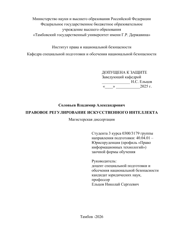 СОЛОВЬЕВ, ВЛАДИМИР АЛЕКСАНДРОВИЧ. ПРАВОВОЕ РЕГУЛИРОВАНИЕ ИСКУССТВЕННОГО ИНТЕЛЛЕКТА [Электронный ресурс]: магистерская диссертация: 40.04.01 Юриспруденция: Право информационных технологий: Заочная форма обучения / В. А. СОЛОВЬЕВ; ТГУ им. Г. Р. Державина ; науч. рук. к. ю. н., профессор, Н. С. Ельцов. — Электрон. текстовые дан. (1 файл). — Тамбов, 2026. — Загл. с титул. экрана. — <URL:https://elibrary.tsutmb.ru/dl/docs/vkr19246.pdf>.