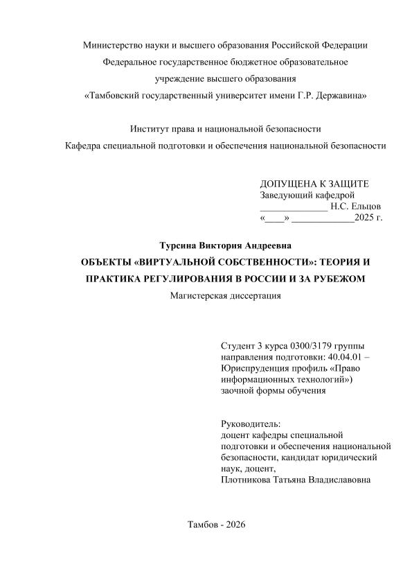 ТУРСИНА, ВИКТОРИЯ АНДРЕЕВНА. ОБЪЕКТЫ «ВИРТУАЛЬНОЙ СОБСТВЕННОСТИ»: ТЕОРИЯ И ПРАКТИКА РЕГУЛИРОВАНИЯ В РОССИИ И ЗА РУБЕЖОМ [Электронный ресурс]: магистерская диссертация: 40.04.01 Юриспруденция: Право информационных технологий: Заочная форма обучения / В. А. ТУРСИНА; ТГУ им. Г. Р. Державина ; науч. рук. к. ю. н., доцент, Т. В. Плотникова. — Электрон. текстовые дан. (1 файл). — Тамбов, 2026. — Загл. с титул. экрана. — <URL:https://elibrary.tsutmb.ru/dl/docs/vkr19247.pdf>.