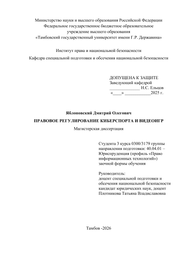 ЯБЛОНОВСКИЙ, ДМИТРИЙ ОЛЕГОВИЧ. ПРАВОВОЕ РЕГУЛИРОВАНИЕ КИБЕРСПОРТА И ВИДЕОИГР [Электронный ресурс]: магистерская диссертация: 40.04.01 Юриспруденция: Право информационных технологий: Заочная форма обучения / Д. О. ЯБЛОНОВСКИЙ; ТГУ им. Г. Р. Державина ; науч. рук. к. ю. н., доцент, Т. В. Плотникова. — Электрон. текстовые дан. (1 файл). — Тамбов, 2026. — Загл. с титул. экрана. — <URL:https://elibrary.tsutmb.ru/dl/docs/vkr19248.pdf>.