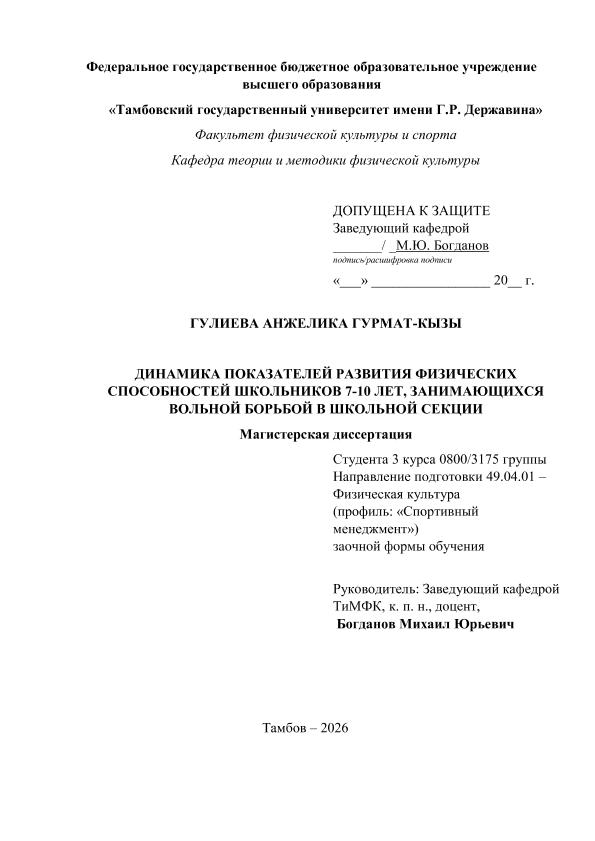 ГУЛИЕВА, АНЖЕЛИКА ГУРМАТ. ДИНАМИКА ПОКАЗАТЕЛЕЙ РАЗВИТИЯ ФИЗИЧЕСКИХ СПОСОБНОСТЕЙ ШКОЛЬНИКОВ 7-10 ЛЕТ, ЗАНИМАЮЩИХСЯ ВОЛЬНОЙ БОРЬБОЙ В ШКОЛЬНОЙ СЕКЦИИ [Электронный ресурс]: магистерская диссертация: 49.04.01 Физическая культура: Спортивный менеджмент: Заочная форма обучения / А. Г. ГУЛИЕВА; ТГУ им. Г. Р. Державина ; науч. рук. к. пед. н., доцент, М. Ю. Богданов. — Электрон. текстовые дан. (1 файл). — Тамбов, 2026. — Загл. с титул. экрана. — <URL:https://elibrary.tsutmb.ru/dl/docs/vkr19249.pdf>.