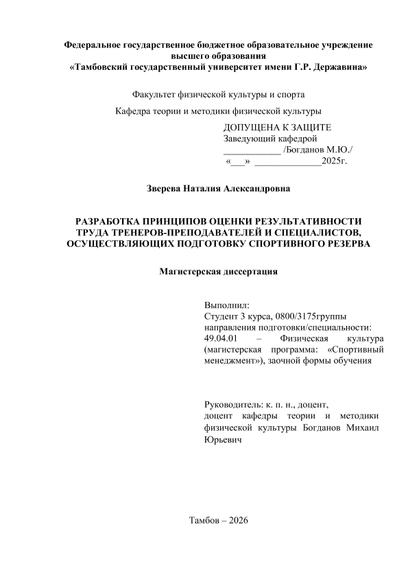 ЗВЕРЕВА, НАТАЛИЯ АЛЕКСАНДРОВНА. РАЗРАБОТКА ПРИНЦИПОВ ОЦЕНКИ РЕЗУЛЬТАТИВНОСТИ ТРУДА ТРЕНЕРОВ-ПРЕПОДАВАТЕЛЕЙ И СПЕЦИАЛИСТОВ, ОСУЩЕСТВЛЯЮЩИХ ПОДГОТОВКУ СПОРТИВНОГО РЕЗЕРВА [Электронный ресурс]: магистерская диссертация: 49.04.01 Физическая культура: Спортивный менеджмент: Заочная форма обучения / Н. А. ЗВЕРЕВА; ТГУ им. Г. Р. Державина ; науч. рук. к. пед. н., доцент, М. Ю. Богданов. — Электрон. текстовые дан. (1 файл). — Тамбов, 2026. — Загл. с титул. экрана. — <URL:https://elibrary.tsutmb.ru/dl/docs/vkr19251.pdf>.