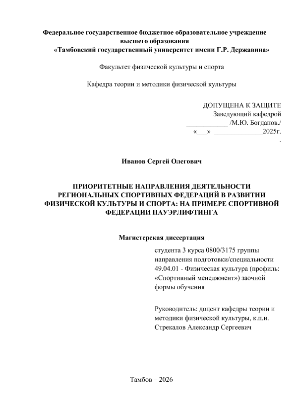 ИВАНОВ, СЕРГЕЙ ОЛЕГОВИЧ. ПРИОРИТЕТНЫЕ НАПРАВЛЕНИЯ ДЕЯТЕЛЬНОСТИ РЕГИОНАЛЬНЫХ СПОРТИВНЫХ ФЕДЕРАЦИЙ В РАЗВИТИИ ФИЗИЧЕСКОЙ КУЛЬТУРЫ И СПОРТА: НА ПРИМЕРЕ СПОРТИВНОЙ ФЕДЕРАЦИИ ПАУЭРЛИФТИНГА [Электронный ресурс]: магистерская диссертация: 49.04.01 Физическая культура: Спортивный менеджмент: Заочная форма обучения / С. О. ИВАНОВ; ТГУ им. Г. Р. Державина ; науч. рук. к. пед. н., доцент, А. С. Стрекалов. — Электрон. текстовые дан. (1 файл). — Тамбов, 2026. — Загл. с титул. экрана. — <URL:https://elibrary.tsutmb.ru/dl/docs/vkr19252.pdf>.