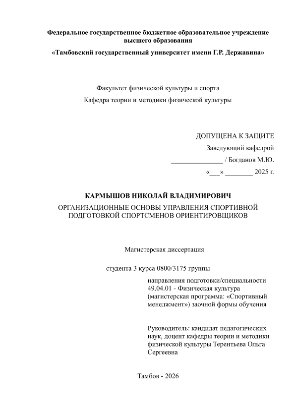 КАРМЫШОВ, НИКОЛАЙ ВЛАДИМИРОВИЧ. ОРГАНИЗАЦИОННЫЕ ОСНОВЫ УПРАВЛЕНИЯ СПОРТИВНОЙ ПОДГОТОВКОЙ СПОРТСМЕНОВ ОРИЕНТИРОВЩИКОВ [Электронный ресурс]: магистерская диссертация: 49.04.01 Физическая культура: Спортивный менеджмент: Заочная форма обучения / Н. В. КАРМЫШОВ; ТГУ им. Г. Р. Державина ; науч. рук. к. пед. н., доцент, О. С. Терентьева. — Электрон. текстовые дан. (1 файл). — Тамбов, 2026. — Загл. с титул. экрана. — <URL:https://elibrary.tsutmb.ru/dl/docs/vkr19253.pdf>.