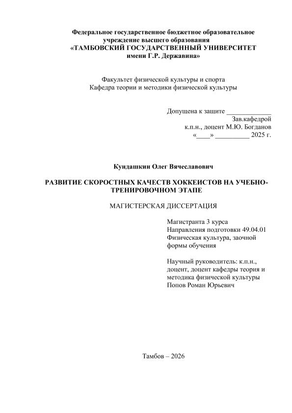 КУНДАШКИН, ОЛЕГ ВЯЧЕСЛАВОВИЧ. РАЗВИТИЕ СКОРОСТНЫХ КАЧЕСТВ ХОККЕИСТОВ НА УЧЕБНО- ТРЕНИРОВОЧНОМ ЭТАПЕ [Электронный ресурс]: магистерская диссертация: 49.04.01 Физическая культура: Спортивный менеджмент: Заочная форма обучения / О. В. КУНДАШКИН; ТГУ им. Г. Р. Державина ; науч. рук. к. пед. н., доцент, Р. Ю. Попов. — Электрон. текстовые дан. (1 файл). — Тамбов, 2026. — Загл. с титул. экрана. — <URL:https://elibrary.tsutmb.ru/dl/docs/vkr19254.pdf>.
