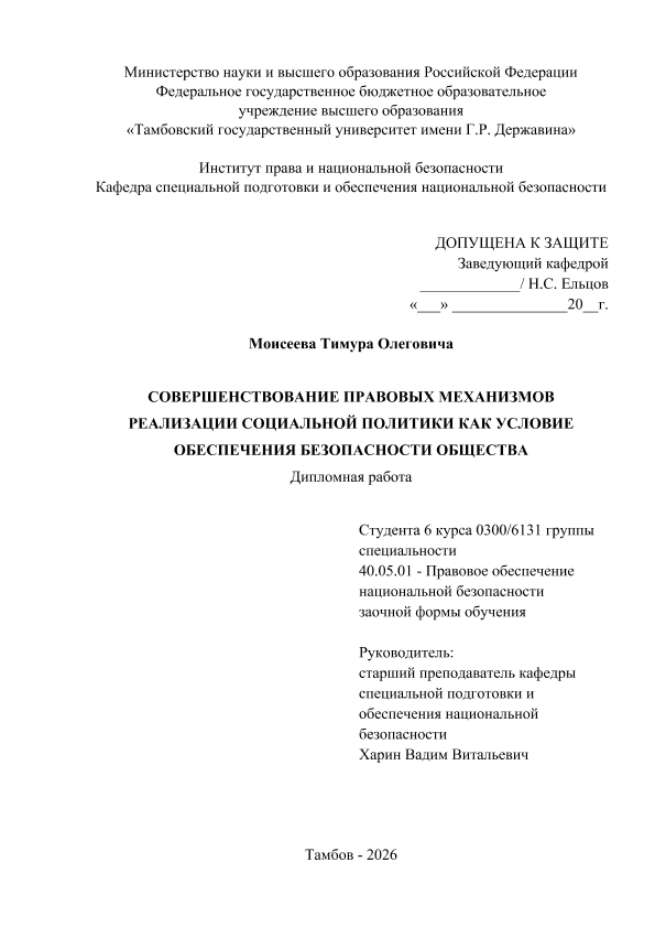 МОИСЕЕВ, ТИМУР ОЛЕГОВИЧ. СОВЕРШЕНСТВОВАНИЕ ПРАВОВЫХ МЕХАНИЗМОВ РЕАЛИЗАЦИИ СОЦИАЛЬНОЙ ПОЛИТИКИ КАК УСЛОВИЕ ОБЕСПЕЧЕНИЯ БЕЗОПАСНОСТИ ОБЩЕСТВА [Электронный ресурс]: дипломная работа: 40.05.01 Правовое обеспечение национальной безопасности: Заочная форма обучения / Т. О. МОИСЕЕВ; ТГУ им. Г. Р. Державина ; науч. рук. , старший преподаватель, В. В. Харин. — Электрон. текстовые дан. (1 файл). — Тамбов, 2026. — Загл. с титул. экрана. — <URL:https://elibrary.tsutmb.ru/dl/docs/vkr19276.pdf>.