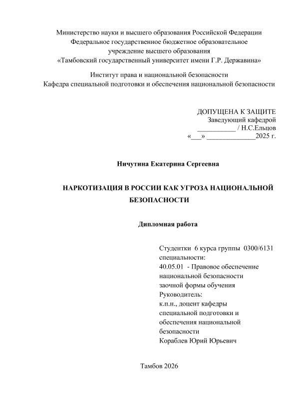 НИЧУТИНА, ЕКАТЕРИНА СЕРГЕЕВНА. НАРКОТИЗАЦИЯ В РОССИИ КАК УГРОЗА НАЦИОНАЛЬНОЙ БЕЗОПАСНОСТИ [Электронный ресурс]: дипломная работа: 40.05.01 Правовое обеспечение национальной безопасности: Заочная форма обучения / Е. С. НИЧУТИНА; ТГУ им. Г. Р. Державина ; науч. рук. к. пед. н., доцент, Ю. Ю. Кораблев. — Электрон. текстовые дан. (1 файл). — Тамбов, 2026. — Загл. с титул. экрана. — <URL:https://elibrary.tsutmb.ru/dl/docs/vkr19277.pdf>.