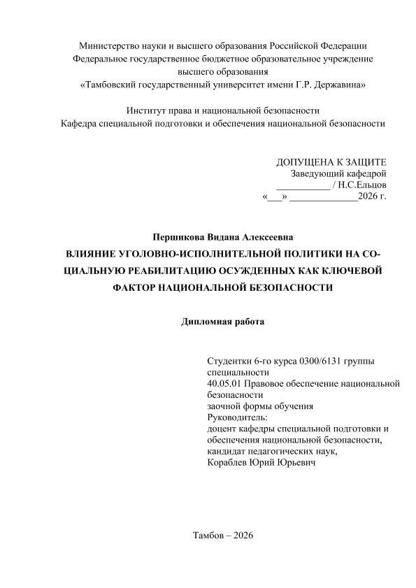 ПЕРШИКОВА, ВИДАНА АЛЕКСЕЕВНА. ВЛИЯНИЕ УГОЛОВНО-ИСПОЛНИТЕЛЬНОЙ ПОЛИТИКИ НА СО- ЦИАЛЬНУЮ РЕАБИЛИТАЦИЮ ОСУЖДЕННЫХ КАК КЛЮЧЕВОЙ ФАКТОР НАЦИОНАЛЬНОЙ БЕЗОПАСНОСТИ [Электронный ресурс]: дипломная работа: 40.05.01 Правовое обеспечение национальной безопасности: Заочная форма обучения / В. А. ПЕРШИКОВА; ТГУ им. Г. Р. Державина ; науч. рук. к. пед. н., доцент, Ю. Ю. Кораблев. — Электрон. текстовые дан. (1 файл). — Тамбов, 2026. — Загл. с титул. экрана. — <URL:https://elibrary.tsutmb.ru/dl/docs/vkr19278.pdf>.