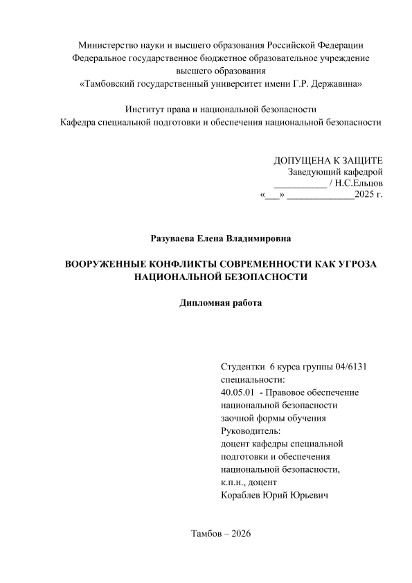 РАЗУВАЕВА, ЕЛЕНА ВЛАДИМИРОВНА. ВООРУЖЕННЫЕ КОНФЛИКТЫ СОВРЕМЕННОСТИ КАК УГРОЗА НАЦИОНАЛЬНОЙ БЕЗОПАСНОСТИ [Электронный ресурс]: дипломная работа: 40.05.01 Правовое обеспечение национальной безопасности: Заочная форма обучения / Е. В. РАЗУВАЕВА; ТГУ им. Г. Р. Державина ; науч. рук. к. пед. н., доцент, Ю. Ю. Кораблев. — Электрон. текстовые дан. (1 файл). — Тамбов, 2026. — Загл. с титул. экрана. — <URL:https://elibrary.tsutmb.ru/dl/docs/vkr19279.pdf>.