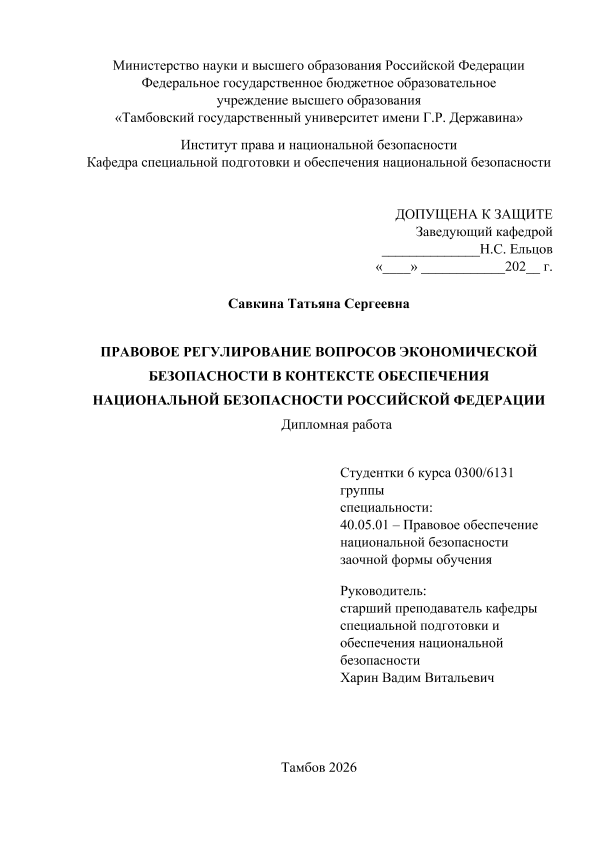 САВКИНА, ТАТЬЯНА СЕРГЕЕВНА. ПРАВОВОЕ РЕГУЛИРОВАНИЕ ВОПРОСОВ ЭКОНОМИЧЕСКОЙ БЕЗОПАСНОСТИ В КОНТЕКСТЕ ОБЕСПЕЧЕНИЯ НАЦИОНАЛЬНОЙ БЕЗОПАСНОСТИ РОССИЙСКОЙ ФЕДЕРАЦИИ [Электронный ресурс]: дипломная работа: 40.05.01 Правовое обеспечение национальной безопасности: Заочная форма обучения / Т. С. САВКИНА; ТГУ им. Г. Р. Державина ; науч. рук. , старший преподаватель, В. В. Харин. — Электрон. текстовые дан. (1 файл). — Тамбов, 2026. — Загл. с титул. экрана. — <URL:https://elibrary.tsutmb.ru/dl/docs/vkr19280.pdf>.