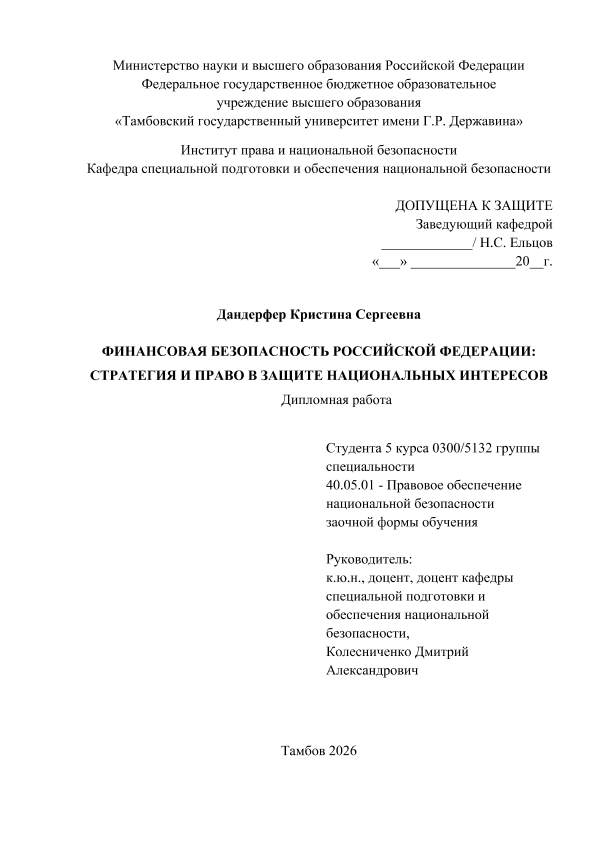 ДАНДЕРФЕР, КРИСТИНА СЕРГЕЕВНА. ФИНАНСОВАЯ БЕЗОПАСНОСТЬ РОССИЙСКОЙ ФЕДЕРАЦИИ: СТРАТЕГИЯ И ПРАВО В ЗАЩИТЕ НАЦИОНАЛЬНЫХ ИНТЕРЕСОВ [Электронный ресурс]: дипломная работа: 40.05.01 Правовое обеспечение национальной безопасности: Заочная форма обучения / К. С. ДАНДЕРФЕР; ТГУ им. Г. Р. Державина ; науч. рук. к. ю. н., доцент, Д. А. Колесниченко. — Электрон. текстовые дан. (1 файл). — Тамбов, 2026. — Загл. с титул. экрана. — <URL:https://elibrary.tsutmb.ru/dl/docs/vkr19281.pdf>.