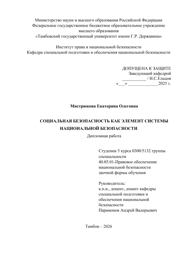 МИСТРЮКОВА, ЕКАТЕРИНА ОЛЕГОВНА. СОЦИАЛЬНАЯ БЕЗОПАСНОСТЬ КАК ЭЛЕМЕНТ СИСТЕМЫ НАЦИОНАЛЬНОЙ БЕЗОПАСНОСТИ [Электронный ресурс]: дипломная работа: 40.05.01 Правовое обеспечение национальной безопасности: Заочная форма обучения / Е. О. МИСТРЮКОВА; ТГУ им. Г. Р. Державина ; науч. рук. к. пед. н., доцент, А. В. Парамонов. — Электрон. текстовые дан. (1 файл). — Тамбов, 2026. — Загл. с титул. экрана. — <URL:https://elibrary.tsutmb.ru/dl/docs/vkr19284.pdf>.
