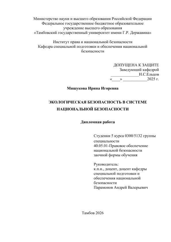 МИШУКОВА, ИРИНА ИГОРЕВНА. ЭКОЛОГИЧЕСКАЯ БЕЗОПАСНОСТЬ В СИСТЕМЕ НАЦИОНАЛЬНОЙ БЕЗОПАСНОСТИ [Электронный ресурс]: дипломная работа: 40.05.01 Правовое обеспечение национальной безопасности: Заочная форма обучения / И. И. МИШУКОВА; ТГУ им. Г. Р. Державина ; науч. рук. к. пед. н., доцент, А. В. Парамонов. — Электрон. текстовые дан. (1 файл). — Тамбов, 2026. — Загл. с титул. экрана. — <URL:https://elibrary.tsutmb.ru/dl/docs/vkr19285.pdf>.