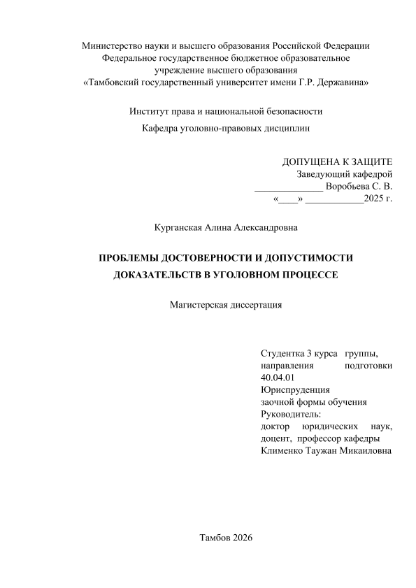КУРГАНСКАЯ, АЛИНА АЛЕКСАНДРОВНА. ПРОБЛЕМЫ ДОСТОВЕРНОСТИ И ДОПУСТИМОСТИ ДОКАЗАТЕЛЬСТВ В УГОЛОВНОМ ПРОЦЕССЕ [Электронный ресурс]: магистерская диссертация: 40.04.01 Юриспруденция: Заочная форма обучения / А. А. КУРГАНСКАЯ; ТГУ им. Г. Р. Державина ; науч. рук. д. ю. н., профессор, Т. М. Клименко. — Электрон. текстовые дан. (1 файл). — Тамбов, 2026. — Загл. с титул. экрана. — <URL:https://elibrary.tsutmb.ru/dl/docs/vkr19306.pdf>.