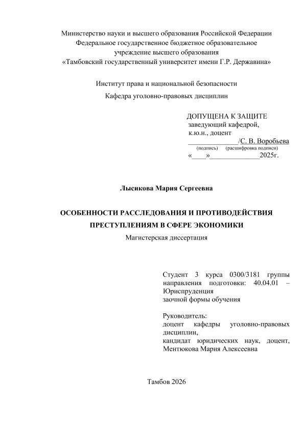 ЛЫСИКОВА, МАРИЯ СЕРГЕЕВНА. ОСОБЕННОСТИ РАССЛЕДОВАНИЯ И ПРОТИВОДЕЙСТВИЯ ПРЕСТУПЛЕНИЯМ В СФЕРЕ ЭКОНОМИКИ [Электронный ресурс]: магистерская диссертация: 40.04.01 Юриспруденция: Заочная форма обучения / М. С. ЛЫСИКОВА; ТГУ им. Г. Р. Державина ; науч. рук. к. ю. н., доцент, М. А. Ментюкова. — Электрон. текстовые дан. (1 файл). — Тамбов, 2026. — Загл. с титул. экрана. — <URL:https://elibrary.tsutmb.ru/dl/docs/vkr19307.pdf>.