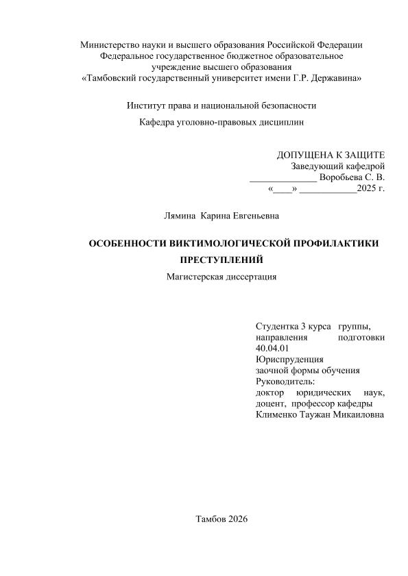 ЛЯМИНА, КАРИНА ЕВГЕНЬЕВНА. ОСОБЕННОСТИ ВИКТИМОЛОГИЧЕСКОЙ ПРОФИЛАКТИКИ ПРЕСТУПЛЕНИЙ [Электронный ресурс]: магистерская диссертация: 40.04.01 Юриспруденция: Заочная форма обучения / К. Е. ЛЯМИНА; ТГУ им. Г. Р. Державина ; науч. рук. д. ю. н., профессор, Т. М. Клименко. — Электрон. текстовые дан. (1 файл). — Тамбов, 2026. — Загл. с титул. экрана. — <URL:https://elibrary.tsutmb.ru/dl/docs/vkr19308.pdf>.