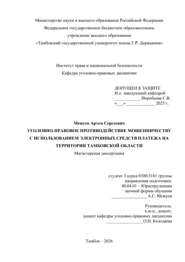 МЕЖУЕВ, АРТЕМ СЕРГЕЕВИЧ. УГОЛОВНО-ПРАВОВОЕ ПРОТИВОДЕЙСТВИЕ МОШЕННИЧЕСТВУ С ИСПОЛЬЗОВАНИЕМ ЭЛЕКТРОННЫХ СРЕДСТВ ПЛАТЕЖА НА ТЕРРИТОРИИ ТАМБОВСКОЙ ОБЛАСТИ [Электронный ресурс]: магистерская диссертация: 40.04.01 Юриспруденция: Заочная форма обучения / А. С. МЕЖУЕВ; ТГУ им. Г. Р. Державина ; науч. рук. к. ю. н., доцент, О. Н. Козодаева. — Электрон. текстовые дан. (1 файл). — Тамбов, 2026. — Загл. с титул. экрана. — <URL:https://elibrary.tsutmb.ru/dl/docs/vkr19309.pdf>.