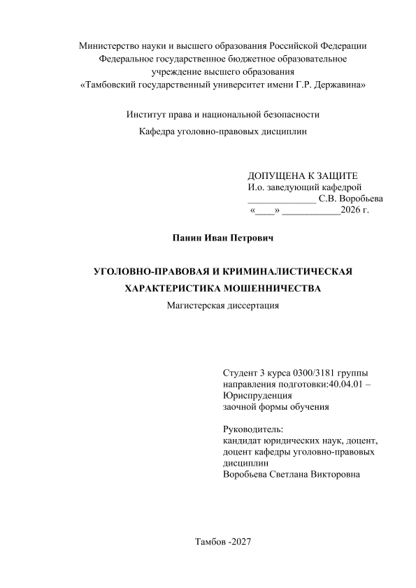 ПАНИН, ИВАН ПЕТРОВИЧ. УГОЛОВНО-ПРАВОВАЯ И КРИМИНАЛИСТИЧЕСКАЯ ХАРАКТЕРИСТИКА МОШЕННИЧЕСТВА [Электронный ресурс]: магистерская диссертация: 40.04.01 Юриспруденция: Заочная форма обучения / И. П. ПАНИН; ТГУ им. Г. Р. Державина ; науч. рук. к. ю. н., доцент, С. В. Воробьева. — Электрон. текстовые дан. (1 файл). — Тамбов, 2026. — Загл. с титул. экрана. — <URL:https://elibrary.tsutmb.ru/dl/docs/vkr19311.pdf>.