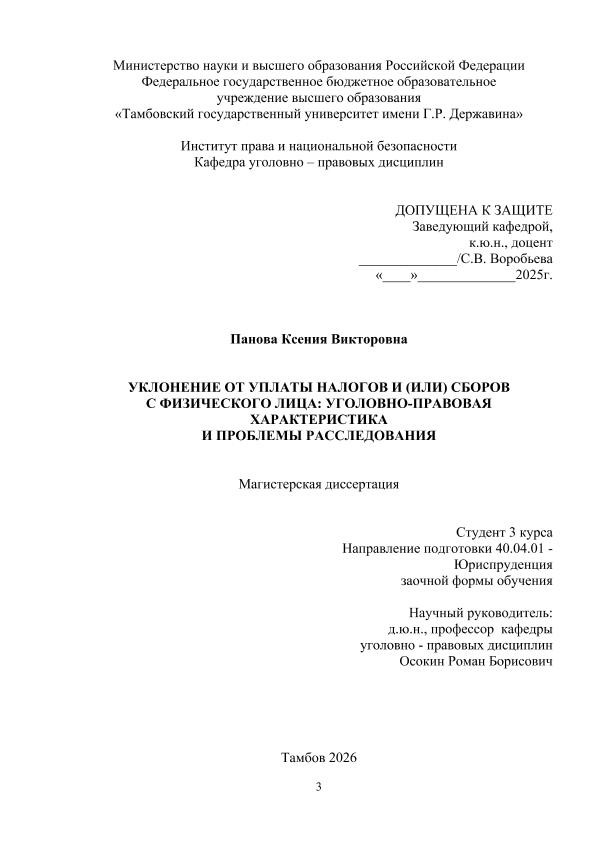 ПАНОВА, КСЕНИЯ ВИКТОРОВНА. УКЛОНЕНИЕ ОТ УПЛАТЫ НАЛОГОВ И (ИЛИ) СБОРОВ С ФИЗИЧЕСКОГО ЛИЦА: УГОЛОВНО-ПРАВОВАЯ ХАРАКТЕРИСТИКА И ПРОБЛЕМЫ РАССЛЕДОВАНИЯ [Электронный ресурс]: магистерская диссертация: 40.04.01 Юриспруденция: Заочная форма обучения / К. В. ПАНОВА; ТГУ им. Г. Р. Державина ; науч. рук. д. ю. н., профессор, Р. Б. Осокин. — Электрон. текстовые дан. (1 файл). — Тамбов, 2026. — Загл. с титул. экрана. — <URL:https://elibrary.tsutmb.ru/dl/docs/vkr19312.pdf>.