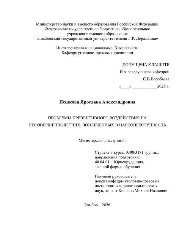 ПЕШКОВА, ЯРОСЛАВА АЛЕКСАНДРОВНА. ПРОБЛЕМЫ ПРЕВЕНТИВНОГО ВОЗДЕЙСТВИЯ НА НЕСОВЕРШЕННОЛЕТНИХ, ВОВЛЕЧЕННЫХ В НАРКОПРЕСТУПНОСТЬ [Электронный ресурс]: магистерская диссертация: 40.04.01 Юриспруденция: Заочная форма обучения / Я. А. ПЕШКОВА; ТГУ им. Г. Р. Державина ; науч. рук. к. ю. н., доцент, М. И. Кольцов. — Электрон. текстовые дан. (1 файл). — Тамбов, 2026. — Загл. с титул. экрана. — <URL:https://elibrary.tsutmb.ru/dl/docs/vkr19313.pdf>.